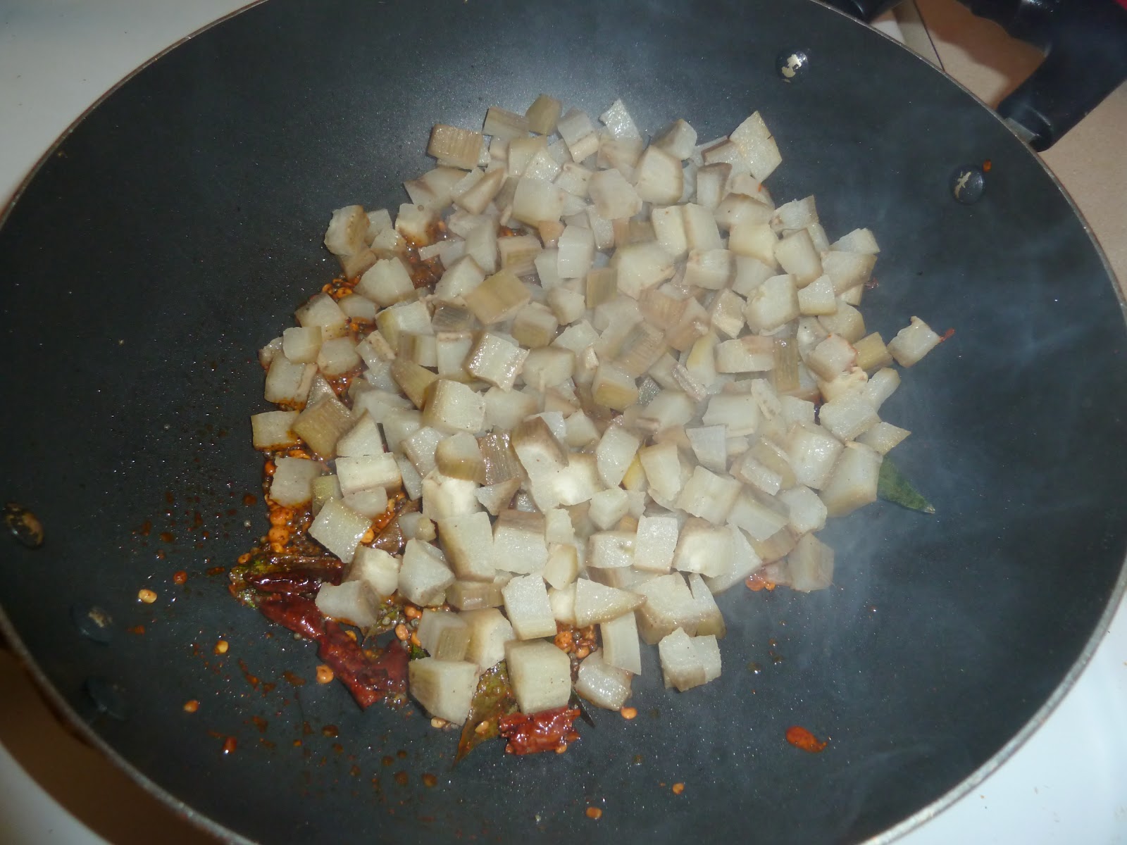 5.Transfer the cooked raw banana pieces and mix well.